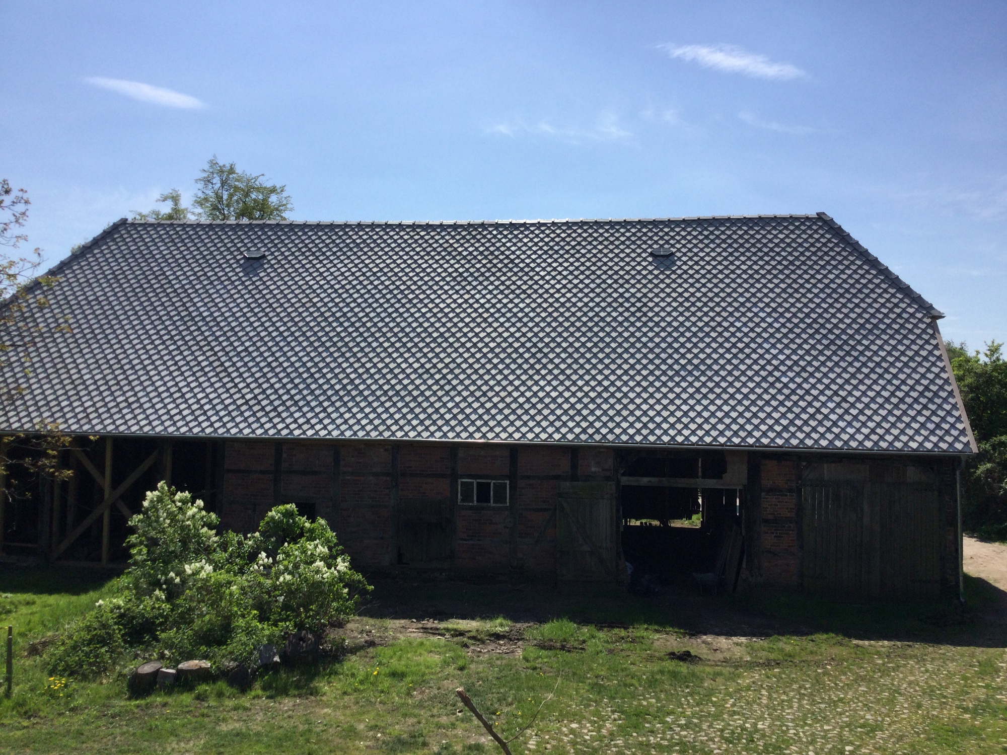 Zum denkmalgeschützten Mühlenensemble gehört auch eine an der Straße liegende Scheune, die laut einer Inschrift im Jahr 1788 errichtet wurde und liebevoll „Barockscheune“ genannt wird. Es handelt sich um eine sog. Querdurchfahrtsscheune – statt in den Giebelseiten sind die Tore in den beiden niedrigeren Traufseiten. Zukünftig soll sie bis zu 12 Künstlerinnen und Künstlern Raum für Begegnung, Leben und Arbeit bieten, und dafür muss sie umfassend ausgebaut werden. Als erster Schritt stand daher die Sicherung des Gebäudes, das über Jahrzehnte kaum genutzt wurde und zusehends verfiel, im Vordergrund: Holzfachwerk und Backsteinausfachungen der Fassade sowie der hölzerne Dachstuhl und die Dacheindeckung mussten denkmalgerecht saniert werden.